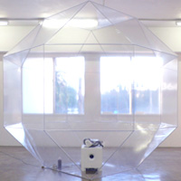 In the smart, compact space of Gallery 360°, a large polygon of transparent, ziplocked plastic dominates the room. To one side, a small version of the same shape in a deep red tone, balances precariously on a thin metal strip that juts from the wall. The walls are covered with a variety of paintings in red and silver. The paintings are both dense and modulated with a surface that seems to both ripple and hover. Created by painstakingly spray-painting onto canvas and aluminum over a period of one to three hours (depending on the size) they are the trace of a movement, a record of a moment lived. "To be conscious of the beat is to feel 'life' itself." With the individual marks like microscopic moments lost in the dense surface of the paint, the works can be read as metaphors for the collectivity of the past and both the particularized and generalized ways in which we remember it.