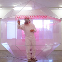 Inside the polygon, Heartbeat 'transcribes' the rhythm of his heartbeat in real time, spray-painting it with a device reminiscent of some kind of medical instrument, the sound of his heart and the sound of the pump filling with new pigment merge to form a deep and resonant beat. Silver booted, wearing white overalls, sporting a sharp haircut and an industrial protective mask he looks part stunt man, part decorator and part eccentric genius.
