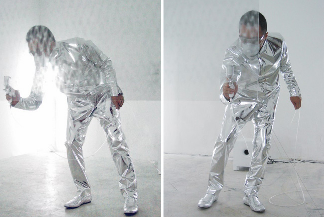 - - - Using the sound of his own heartbeat to regulate his movements, Heartbeat-SASAKI drew on a suspended pane of glass using silver paint.